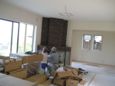 1Fのリビングの暖炉周りの石が貼りあがりました。