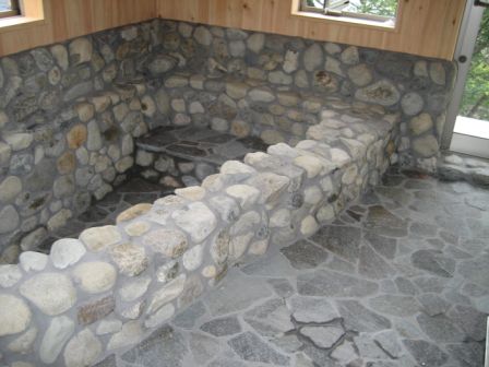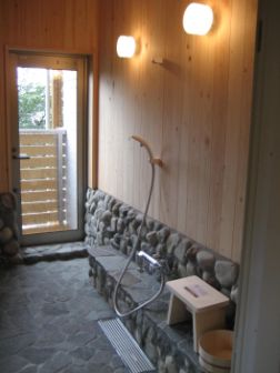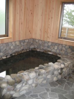 お風呂の石も貼りあがりましたよ。どうです?温泉の雰囲気出てるでし